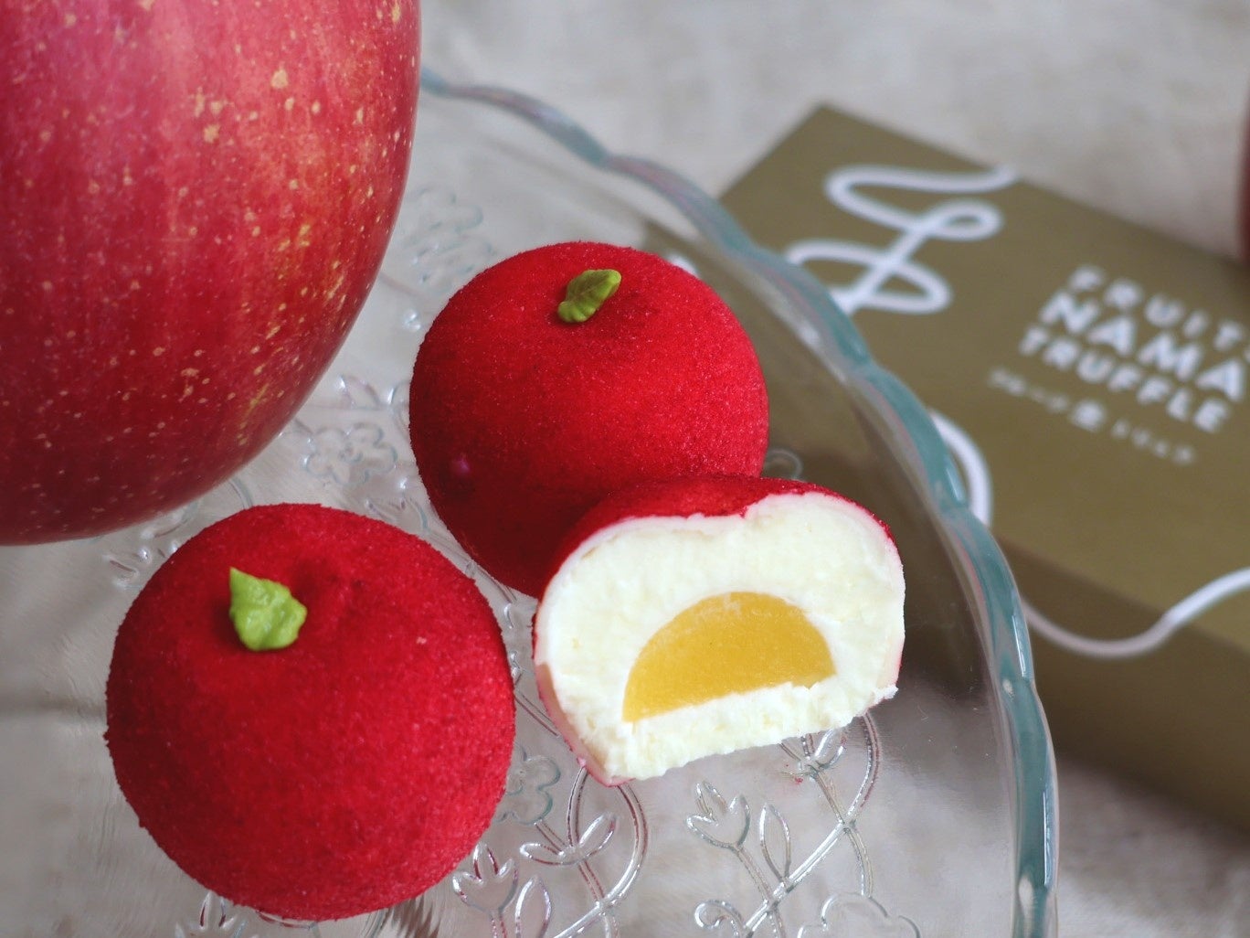 フルーツ生トリュフシリーズ第4弾、秋の「北海道りんご」が新登場!ホワイトチョコレートクリームの中からとろけ出す、やさしい甘さの北海道産りんごのコンポート。まわりのパウダーはフランボワーズで、可愛らしく仕上げました。