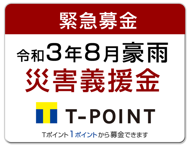 「Tポイント募金」につきましては、パソコン・スマートフォンの「Tポイント募金」サイト(http://tsite.jp/d/)の「令和3年8月豪雨災害義援金」にて、T会員のみなさまがお持ちのTポイントを1ポイント(1円相当)から寄付が可能です。