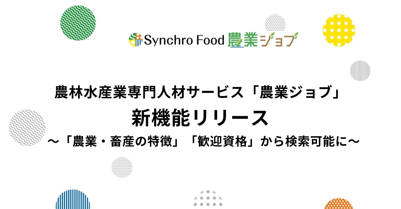 農林水産業専門の人材サービス「農業ジョブ」を運営する株式会社シンクロ・フード(本社:東京都渋谷区、代表取締役:藤代真一、東証プライム市場:3963)は、農業ジョブの求人検索方法として「歓迎資格から探す」「農業・畜産の特徴から探す」機能をリリースいたしました。