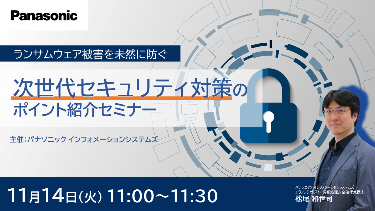 パナソニック インフォメーションシステムズ株式会社は、2023年11月14日(火)『ランサムウェアを未然に防ぐ次世代セキュリティ対策のポイント紹介セミナー』を開催します。