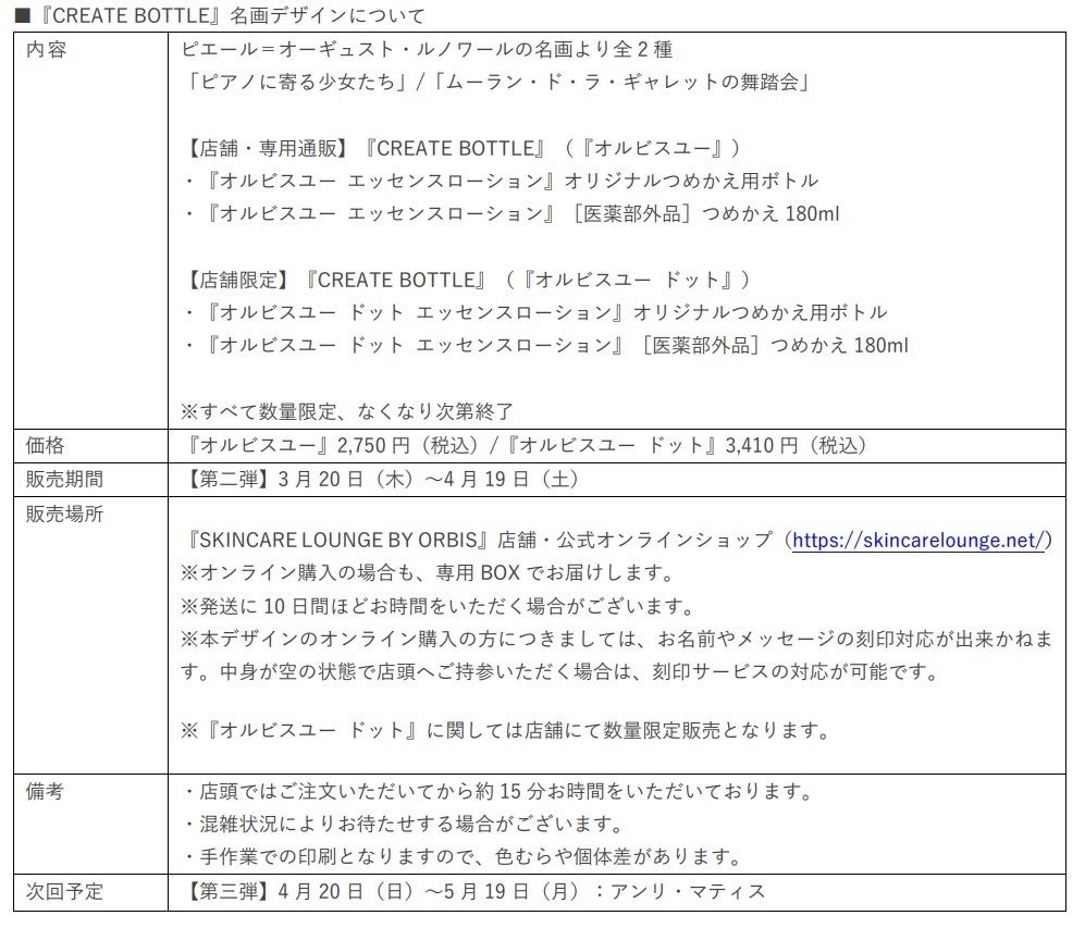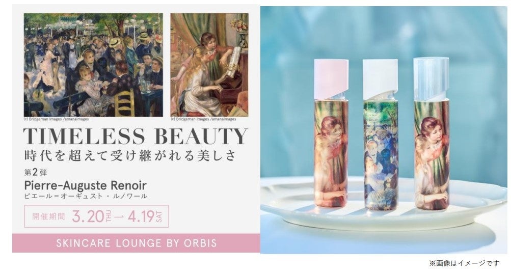 この度、2025 年 2 月 22 日(土)~5 月 19 日(月)の期間、『SKINCARE LOUNGE BY ORBIS』にて体験型アートイベント「TIMELESS BEAUTY~時代を超えて受け継がれる美しさ~」を開催します。『SKINCARE LOUNGE BY ORBIS』限定サービスとしてご好評いただいている『CREATE BOTTLE』に、全 3 回に分けて名画デザインが登場いたします。第二弾として 3 月 20 日(木)からは、ピエール=オーギュスト・ルノワールの名画から 2 種の限定ボトルやドリンクを販売開始します。
