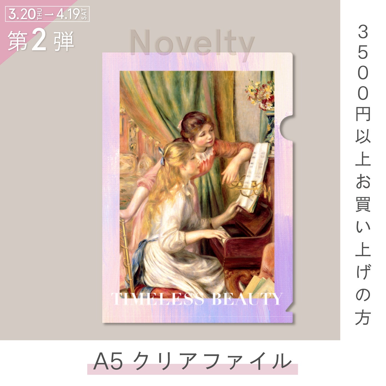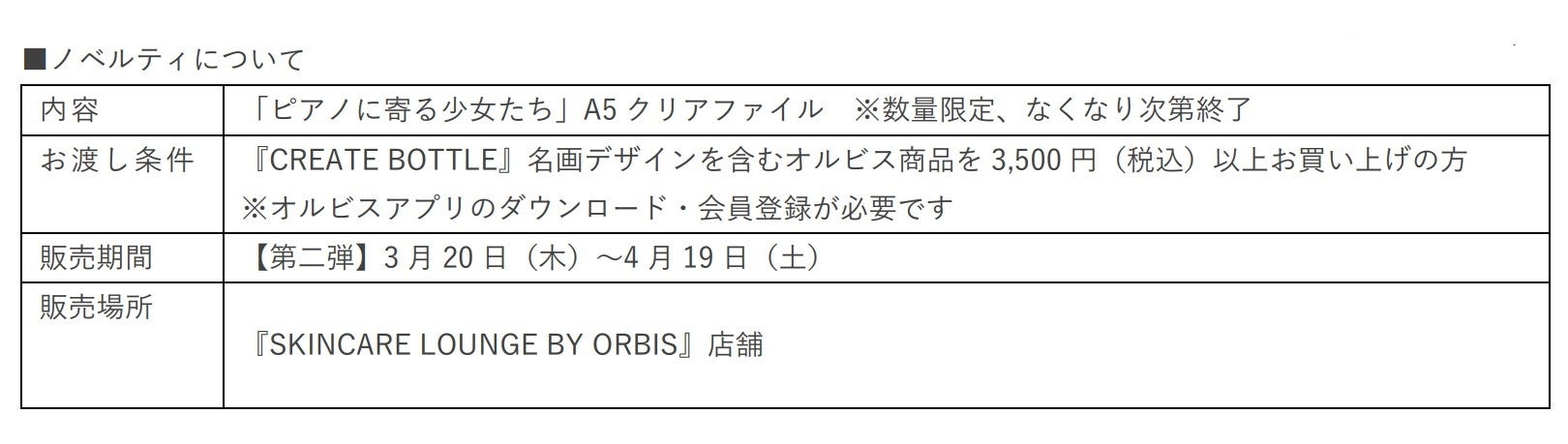 『SKINCARE LOUNGE BY ORBIS』店舗限定でノベルティをご用意しております。『CREATE BOTTLE』名画デザインを含むオルビス商品を 3,500 円(税 込)以上お買い上げの方に先着順で名画「ピアノに寄る少女たち」の A5 クリアファイルをプレゼントいたします。