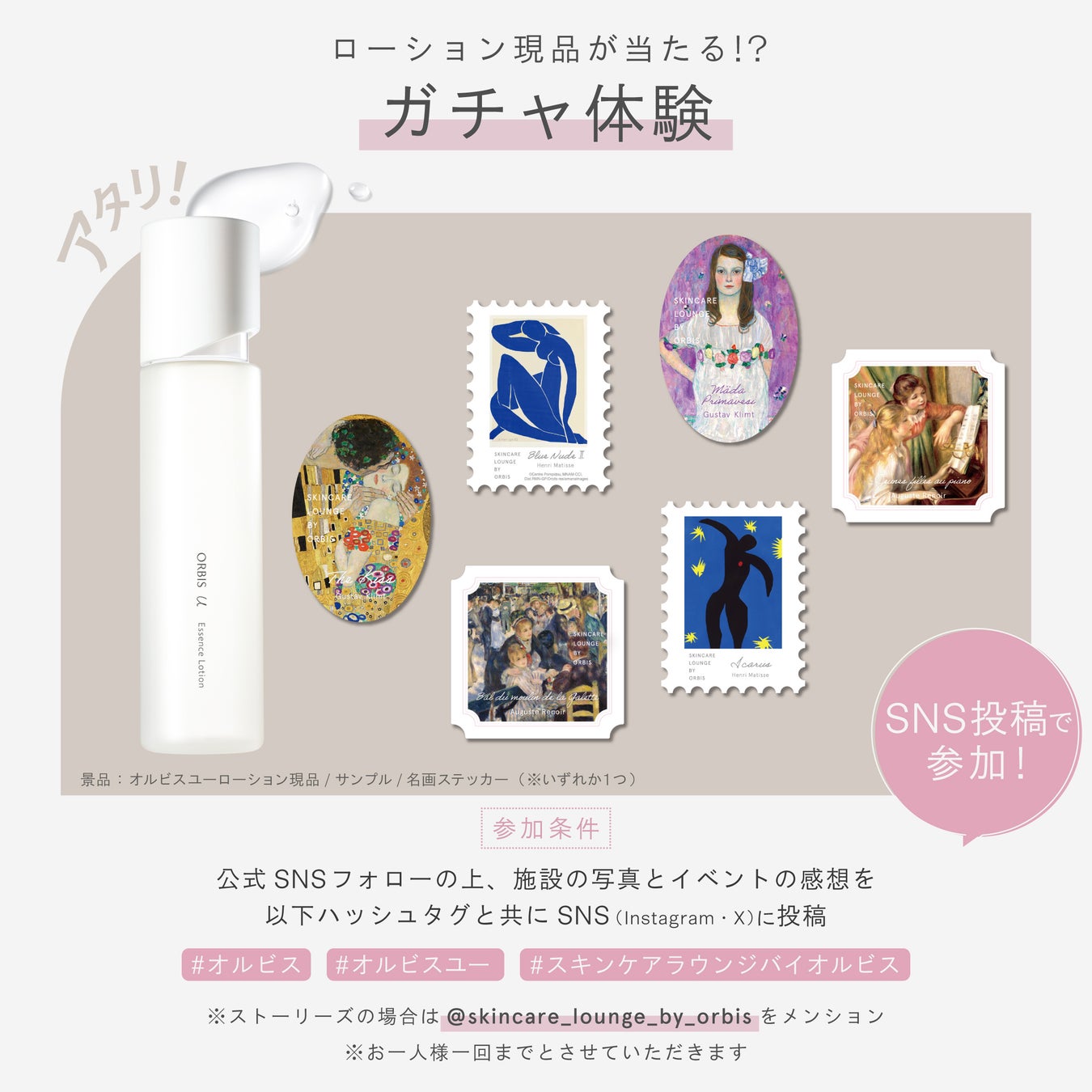 本イベントの様子を SNS に投稿で、プレゼントが必ず当たるガチャガチャを体験いただけます。景品として『オルビスユーシリーズ』のローション現品またはスキンケアサンプルセット、名画ステッカー全 6 種をご用意しております。