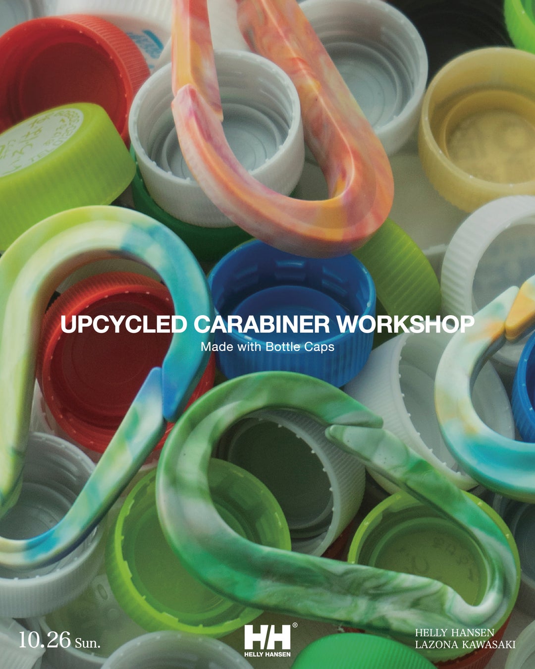 ラゾーナ川崎プラザ内で回収された使用済みのペットボトルのキャップを利用して、HELLY HANSENオリジナルデザインのカラビナを作ります。