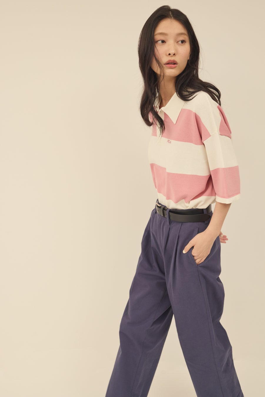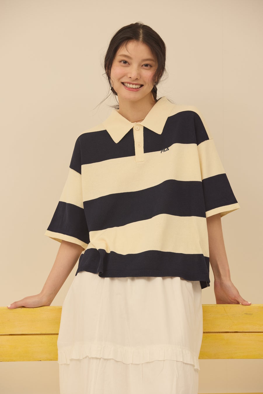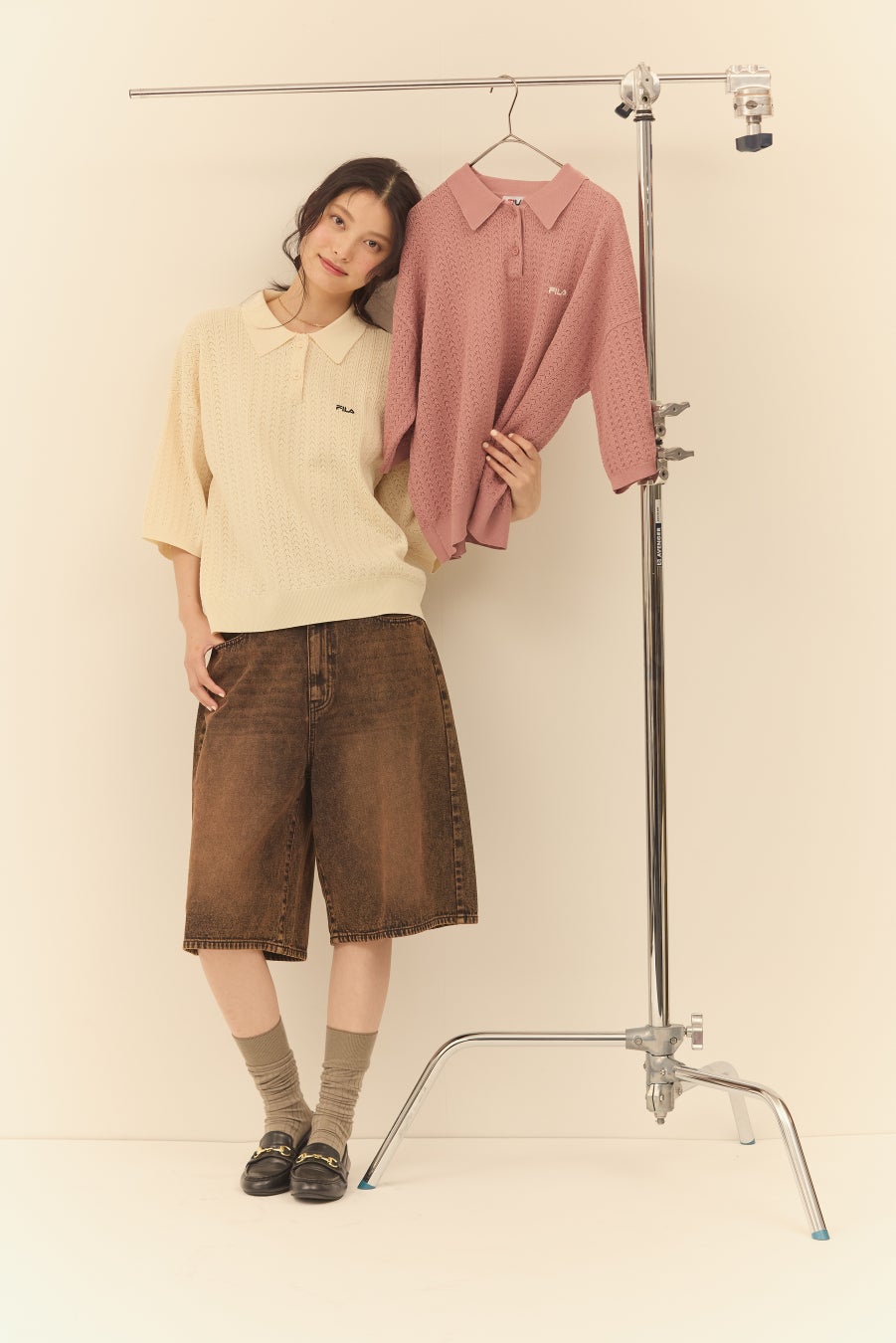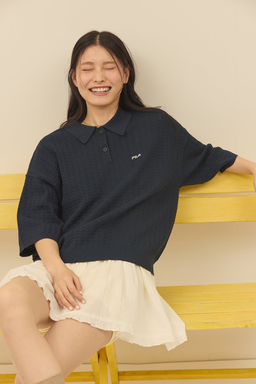 レトロ×スポーティーなデザインがお洒落感度の高いアイレット編みのポロニット