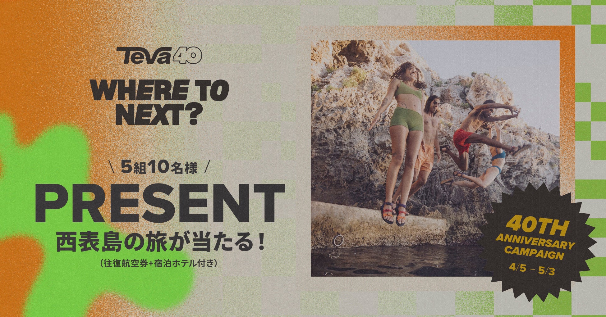 (2024年4月3日)- TOKYO, Japan, 1984年に世界で初めてストラップ付きスポーツサンダルを開発したことから誕生し、今年40周年を迎えるTeva®(テバ)は、ブランド創立40周年を記念して、「Where to Next? − 次はどこへ行こう−」キャンペーンを発表します。また、REVIVE COLLECTIONとして、Tevaの初期のモデルや過去の名品をモダンにアレンジしたサンダルとハットを4月より販売中です。さらに、4月5日(金)からは西表島で自然の楽しさや環境問題に触れられる、Tevaがキュレートする旅が当たるプレゼントキャンペーンを開催します。