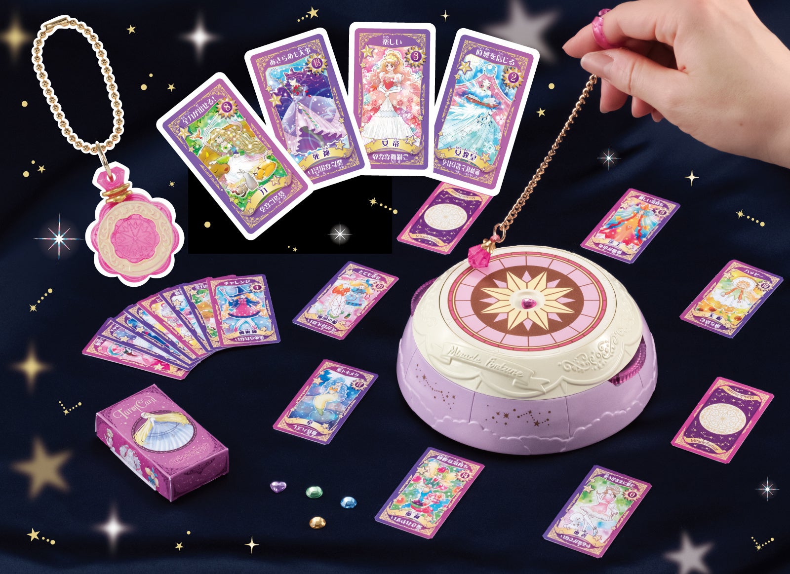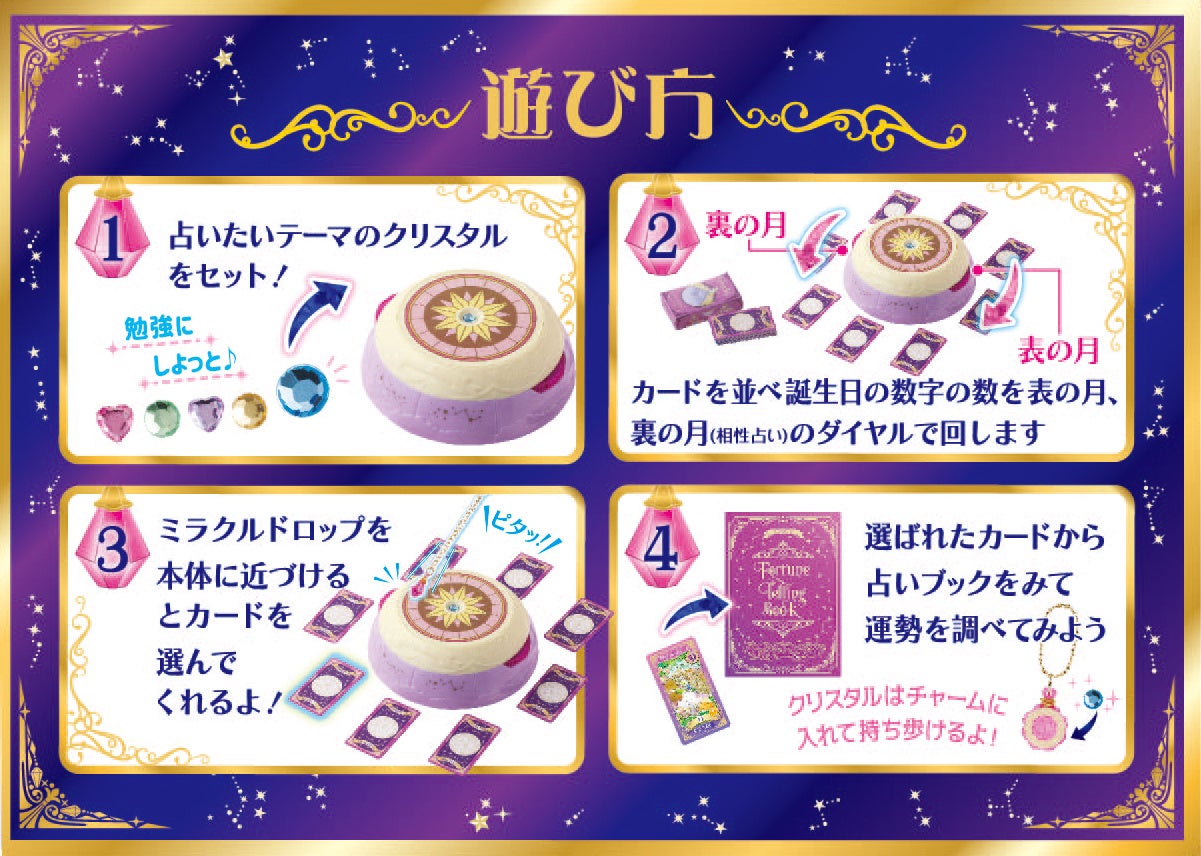 本商品は、「恋」「友情」「勉強」「スポーツ」「人気」などについて占うことのできる新感覚占いトイです。遊び方は本体の中央に占いたいテーマのクリスタルをセットし、本体の周りにシャッフルしたカードを配置します。本体のダイヤルを自分や占いたい相手の誕生日など規定の回数を回します。そしてミラクルドロップを本体にかざしマジカルサークルに沿ってまわします。ミラクルドロップがピタッと止まった位置に置いてあるカードが選ばれたカードとなり、そのカードの意味を付属の占いブックを見ながら占い結果を確認することができます。本体に置いたクリスタルは思いを込めてチャームに入れて持ち歩くこともできます。今日のラッキースポット、アイテム、カラーなど占うことができます。