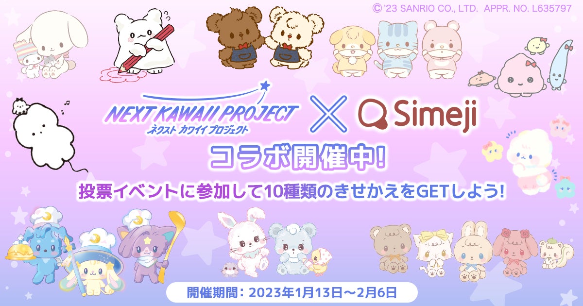 バイドゥ株式会社(本社:東京都港区、代表取締役社長:Feng Jiang)が提供する日本語入力&きせかえ顔文字キーボードアプリ「Simeji」(iOS、Android版)は、株式会社サンリオ(本社:東京都品川区 代表取締役社長:辻󠄀 朋邦)が開催中の、新たなKAWAIIの原石を見つける新キャラクタープロジェクト「NEXT KAWAII PROJECT(ネクストカワイイプロジェクト)」とのコラボレーションを本日より2023年2月6日(月)まで実施いたします。