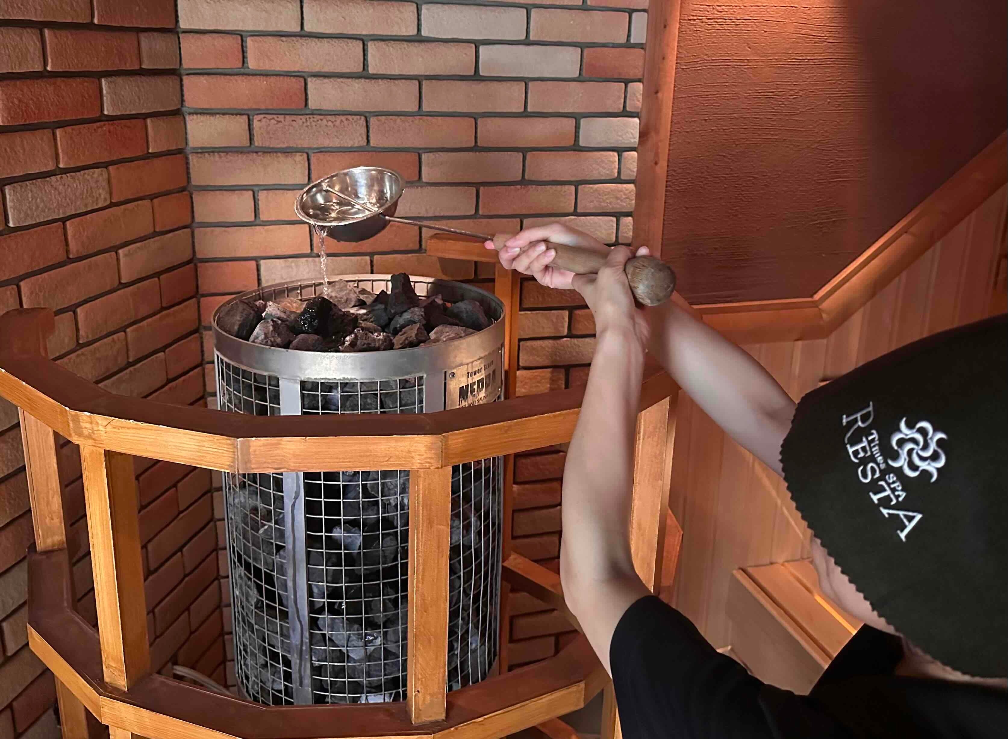 サウナストーンにアロマ水をかけて蒸気を発生させ、スタッフがウチワで熱風を送ることで、室内に広がるアロマの香りと熱波が楽しめます。