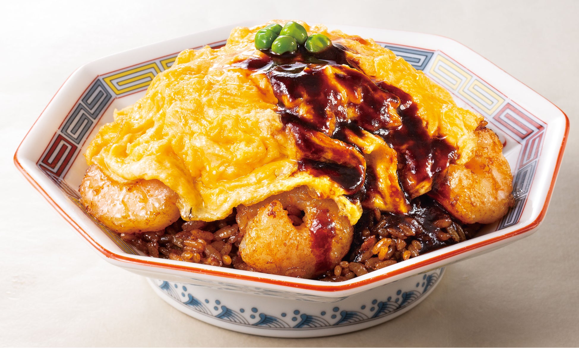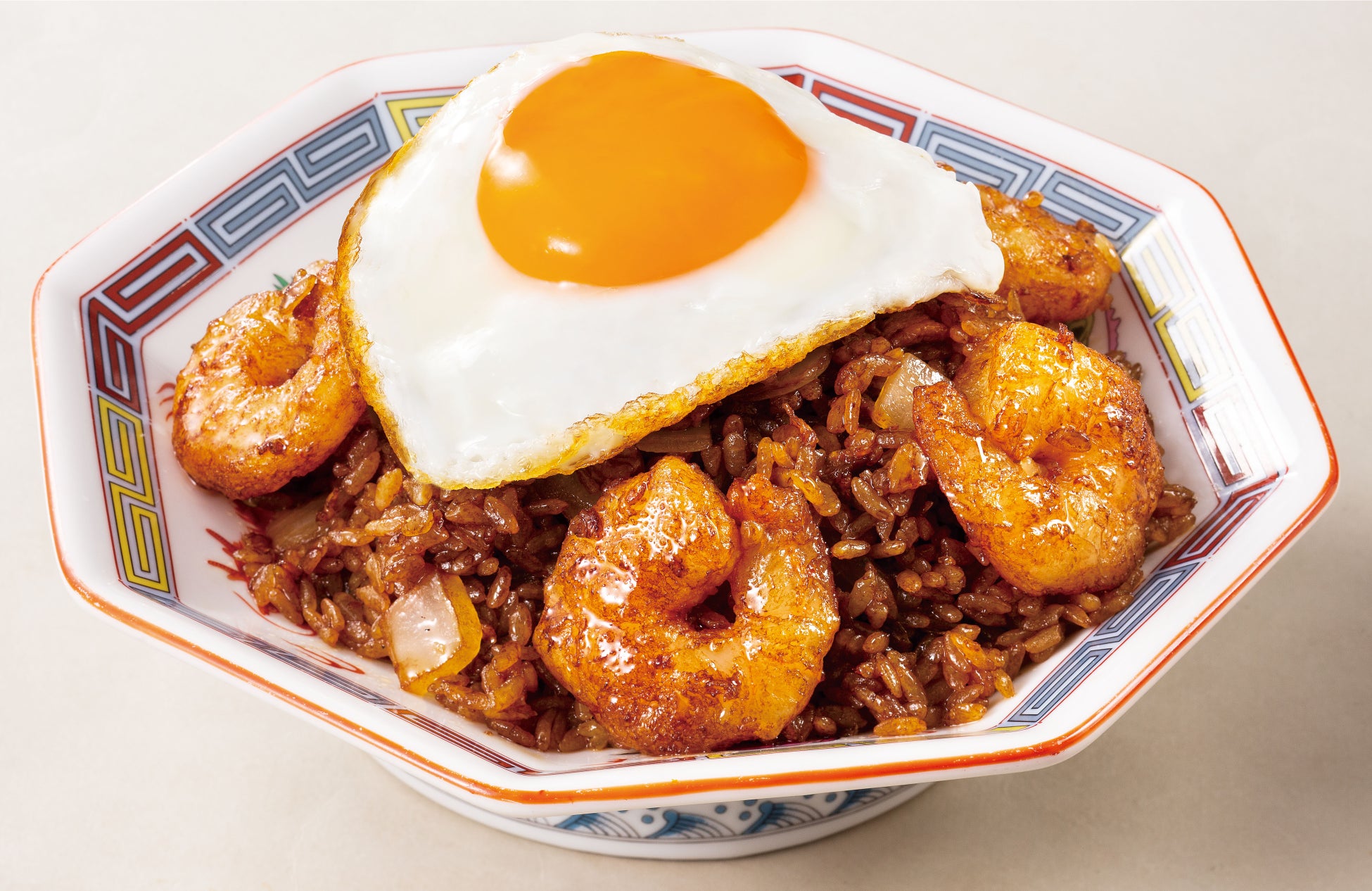 香り高いスパイス(カレー粉・豆板醤)を効かせた炒飯に、香ばしく焼き上げた大ぶりの海老と、半熟の目玉焼きをトッピングして、スパイシーなコク旨ソースが食欲をそそる、大阪王将流の“えびめし”です。トッピングの目玉焼きは、とろとろ玉子に変更し、「オムえびめし」を楽しむこともできます。本来のえびめしでは錦糸玉子が使われますが、目玉焼きやとろとろ玉子で楽しめるよう、大阪王将らしくアレンジしています。