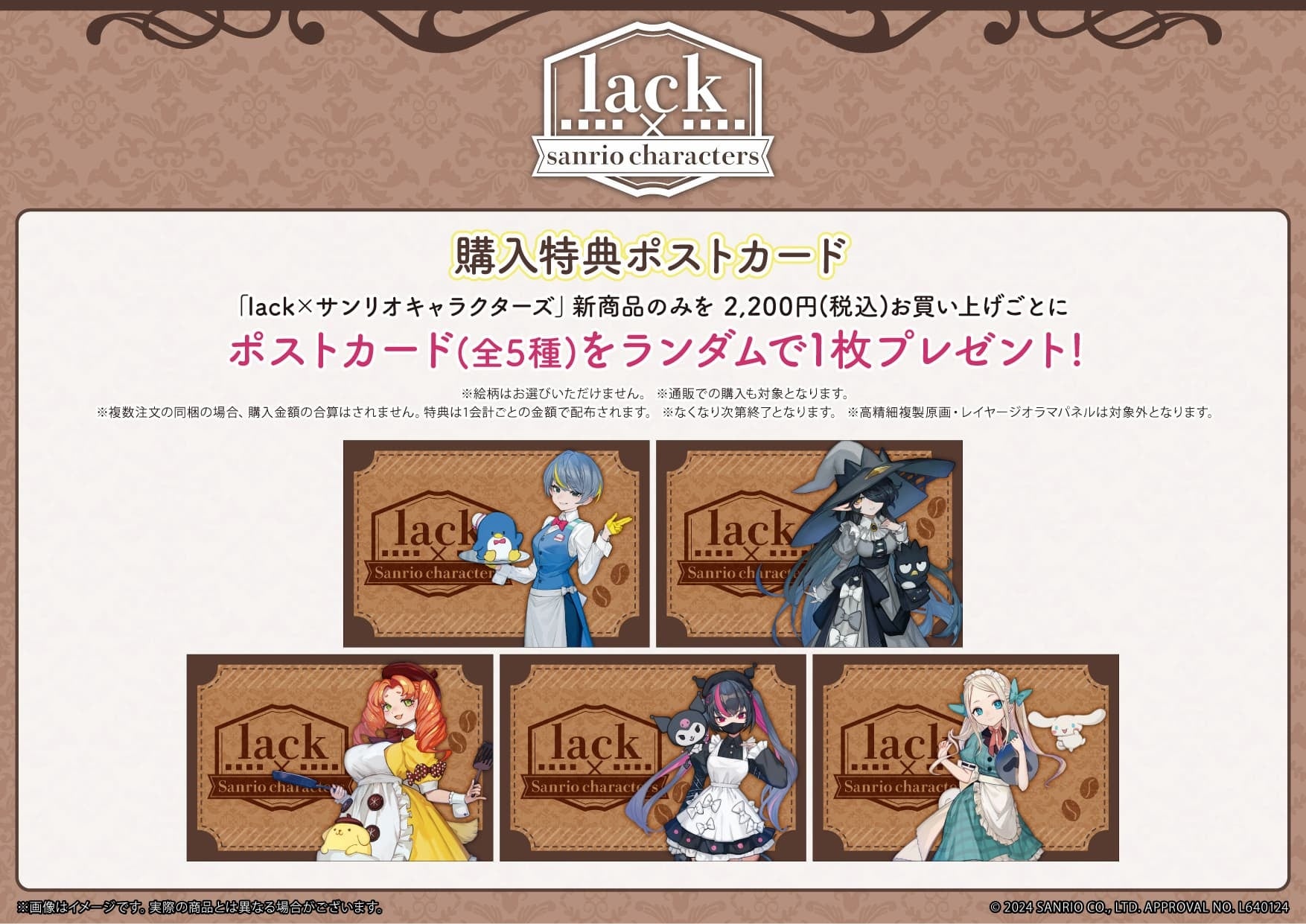 「lack×サンリオキャラクターズ」新商品のみを1会計2,200円(税込)お買い上げごとに、購入特典としてポストカード(全5種)をランダムで1枚プレゼント。