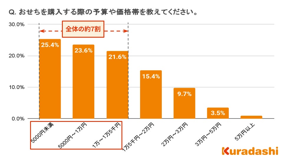 また、Kuradashiが10月に実施したユーザー調査(※4)によると、おせちを購入する際の予算について回答者の約7割が「1万5千円以下」を希望していることが分かりました。おせち選びで重視するポイントでは「おいしさ」が最も多く40.8%、次いで「価格」が21.6%、「品数や内容」は14.2%となりました。