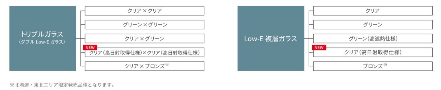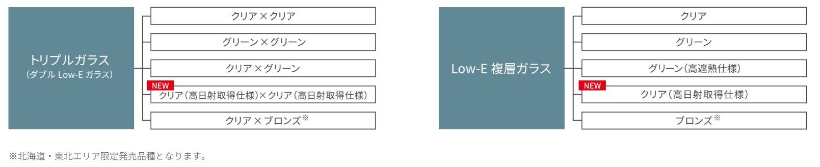 高性能窓「TW」と樹脂窓「EW」のトリプルガラスと複層ガラスにLow-Eクリア(高日射取得仕様)を追加し、発売