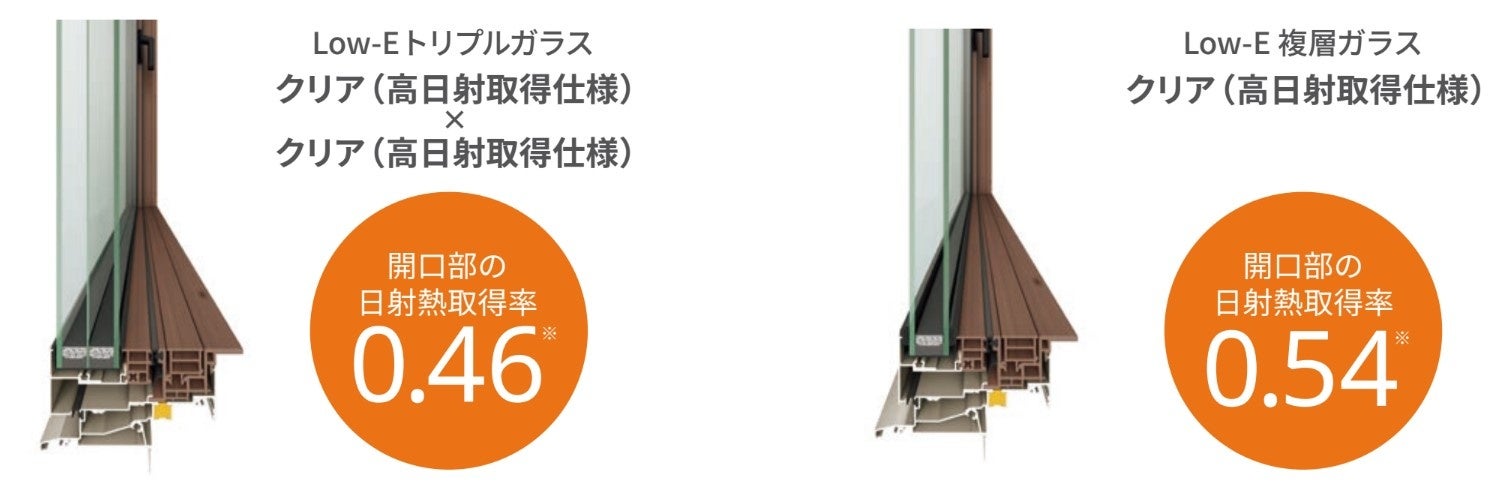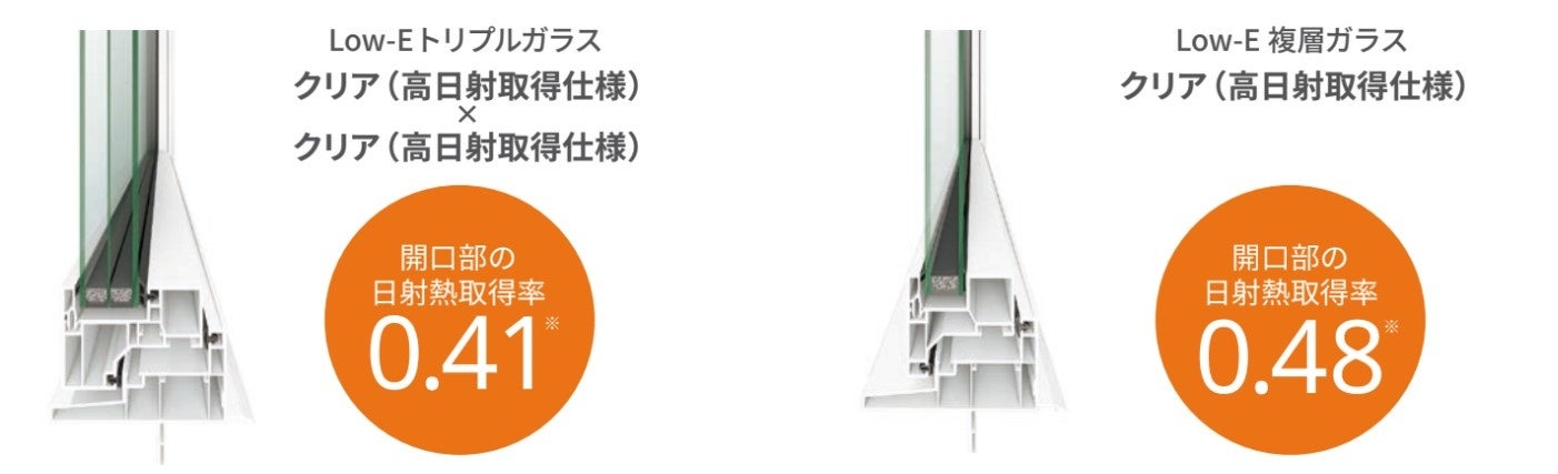 高性能窓「TW」においては、樹脂とアルミの複合構造の窓として業界トップクラスの断熱性能(熱貫流率0.98(W/(㎡・K)))(※2)でありながら、樹脂窓よりもスリムなフレームでガラス面積が大きいことに加え、今回の高日射取得仕様のガラスの採用により、複層ガラス仕様の日射取得率は0.54(※3)と業界トップクラスの日射取得率を実現しています。