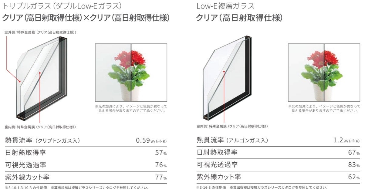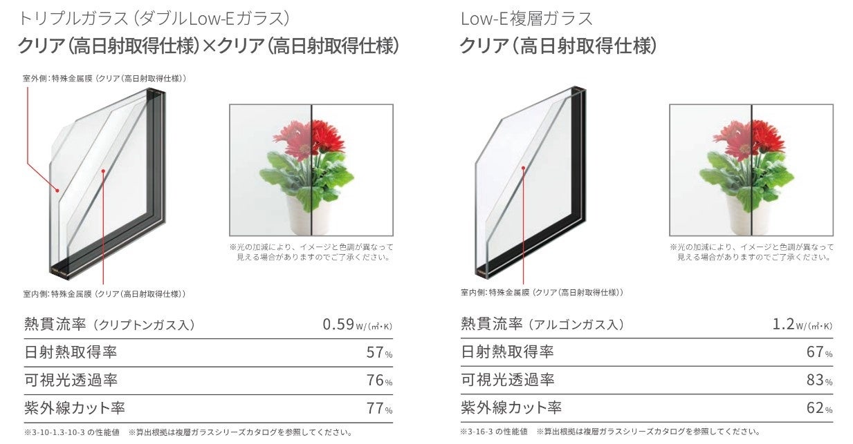 ※トリプルガラス:3-kr13-1.3-kr13-3、複層ガラス:3-Ar16-3の性能値