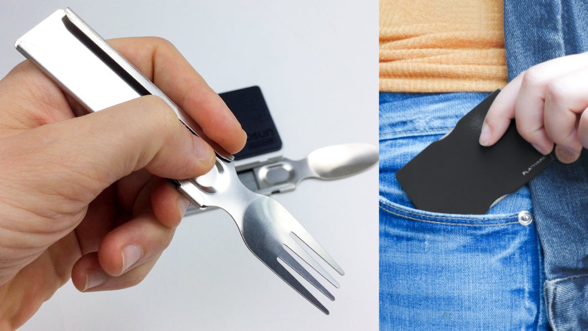 「Flatware(フラットウェア)」は、持ち運びに便利な超薄型4mmの折りたたみ式スプーン&フォーク。カード型保護ケースに収納して持ち運び、スライドさせるだけでカトラリーに大変身。荷物をなるべく減らしたいアウトドアシーンや、いざというときの防災グッズとしても役立ちます。