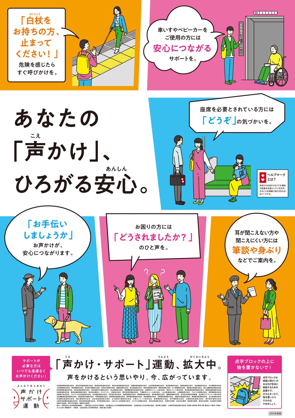 「声かけ・サポート」運動は、お客さまに鉄道などの施設を安全に安心してご利用いただけるよう、お困りのお客さまに対して社員から積極的に声をおかけするとともに周囲のお客さまからもお声かけにご協力いただく取組みです。