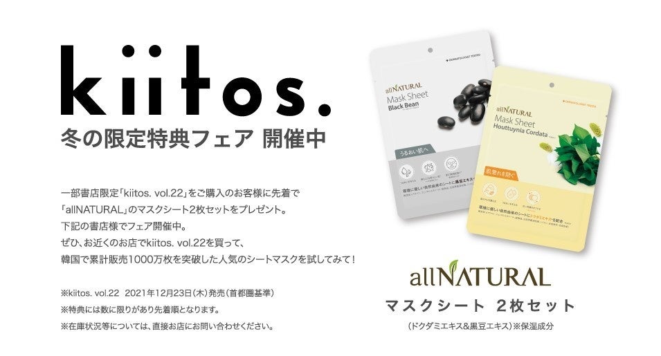 | 一部書店限定のフェアとして、「kiitos. vol.22」をご購入のお客様に、先着で「allNATURAL」のマスクシート2枚セットをプレゼント。ぜひ、お近くのお店でkiitos. vol.22を買って、韓国で累計販売1000万枚を突破した人気のマスクシートを試してみて! フェア実施店舗につきましてはこちらよりご確認ください。 kiitos. vol.22 マスクシート フェア実施店舗:https://www.sun-a.com/sp/kiitos22/ ※特典は数に限りがあり先着順となります。 ※在庫状況等につきましては、直接店舗にお問い合わせください。 |