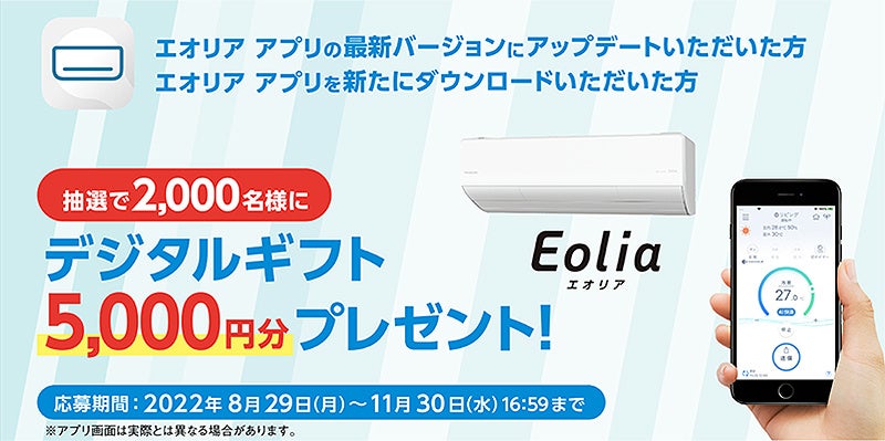 パナソニック株式会社では、アプリを使い、2022年8月29日(月)より「エオリア アプリ最新バージョンを使おう」キャンペーンを実施します。対象期間中に、エオリア アプリの最新バージョンにアップデートもしくは、エオリア アプリを新たにダウンロードいただいた方に、抽選で2,000名様にデジタルギフト5,000円分をプレゼントします。
