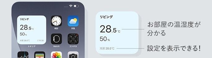 エオリア アプリの最新バージョンでは、アプリを開かなくてもスマホのホーム画面から「ウイジェット」で、お部屋の温湿度と設定が表示できるようになりました。お部屋の高温状態やエアコンの消し忘れに気づくことができ、より便利になりました。