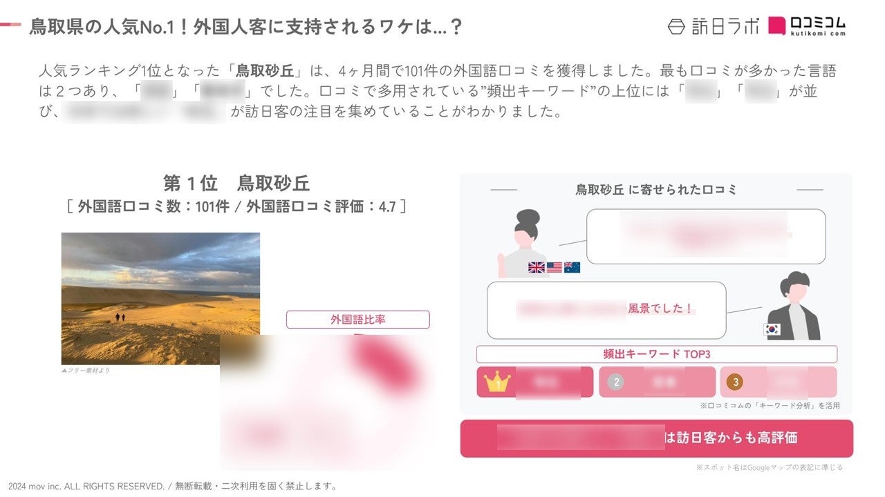 業界最大級のインバウンドビジネスメディア「訪日ラボ」及び AI店舗支援SaaS「口コミコム」を運営する株式会社mov(代表取締役:渡邊 誠、本社:東京都渋谷区、以下mov)は、各都道府県の観光スポットに寄せられた最新の口コミデータから、独自の『インバウンド人気観光地ランキング』を発表しました。