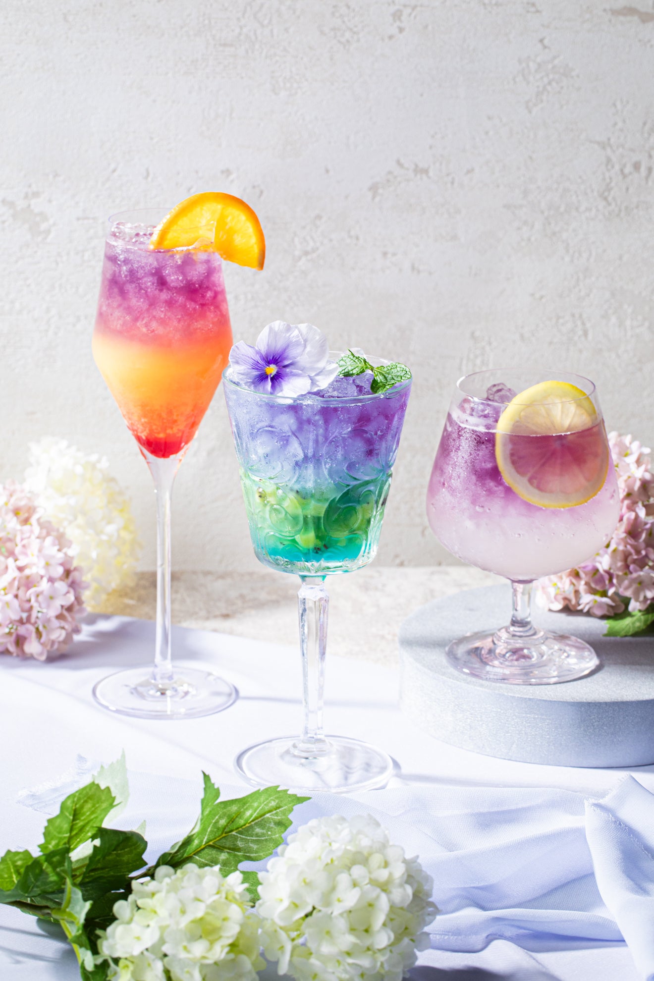 キウイやミントで爽やかさを組み合わせ、紫陽花に見立てた色鮮やかなカクテルは混ぜることで色の変化も楽しめる【バタフライエフェクト】、