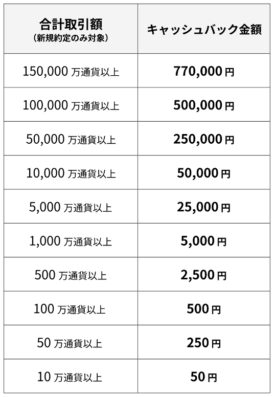 対象期間中に、本キャンペーンにエントリーし、「FXネオ」の新規建てのお取引(10万通貨以上)をされた個人のお客様を対象に、取引数量に応じて最大77万円をキャッシュバックいたします。