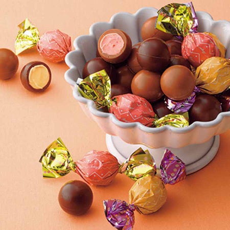 ストロベリークリームをミルクチョコレートに閉じ込めた[ストロベリー]と、レモン風味のクリームをスイート系のチョコレートに閉じ込めた[レモン]。2種類のフルーツの風味が楽しめる、ころんとかわいらしいひと口サイズのショコラです。