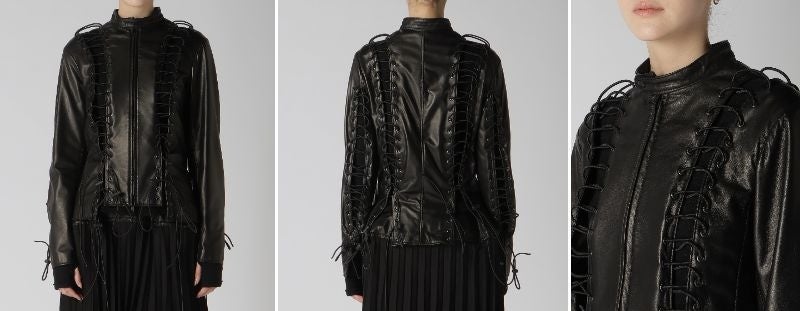 スタンドカラー(ジャンパーホック留め)、ダブルジッパー、前後アシンメトリー仕様、アジャスターによるスピンドルの緩急調整、様々なインナーに対応できるレースアップ幅の調整、肌ざわりが柔らかく使用するほどに馴染む経過効果、微光沢なカウレザー