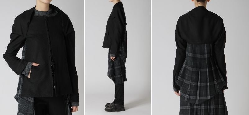 適度な膨らみのあるウールに、伸縮性のポリウレタンを組み合わせたミドルサージ黒、ノーカラー、ショルダーラップスリーブ、ダブルシッパー、前身頃にスラッシュポケット、後身頃にプリーツ加工を施したクラシカルな英国調チェックのプリーツディティール、ウール