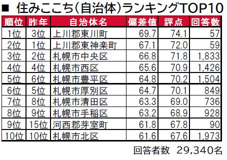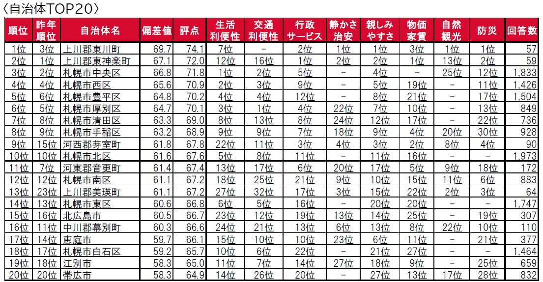 1位は、北海道のほぼ中央の旭川市に隣接し北海道最高峰の旭岳を有し、全戸が豊かな地下水で生活する全国でも珍しい上水道がない町・上川郡東川町です。景観条例を制定し、子育て・起業化支援にも力を入れ、独自の町づくりを推進しています。2位は、旭川市・東川町に隣接するベッドタウンの上川郡東神楽町です。町内に旭川空港があるため道外へのアクセスも便利な町です。3~8位、そして10位は札幌市の行政区ですが、9位には十勝平野のほぼ中央に位置する河西郡芽室町(昨年15位)がランクインしました。