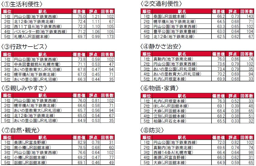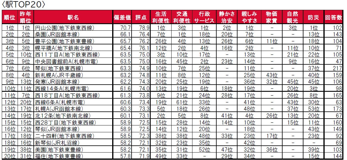 ランキング<札幌都市圏版>」2019年版と2020年版でも1位になっています。2位は、2年連続で函館、3位はJR千歳線の「新さっぽろ」と「新札幌」を統合した新札幌Aです。トップ5は順位変動はあるものの、昨年と同じ顔ぶれです。