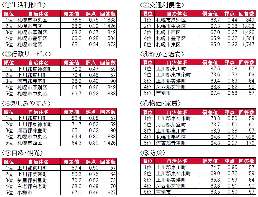 ●「行政サービス」「静かさ治安」「親しみやすさ」「防災」因子では、今年の「住みここち(自治体)ランキング」でトップ2となった上川郡の自治体(東川町・東神楽町)がトップ2を独占する高い評価を得ています。その他、東神楽町は「物価・家賃」因子、東川町は「自然・観光」因子でもそれぞれ1位です。