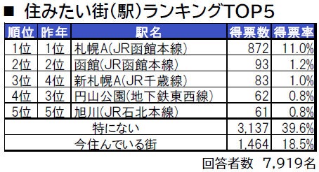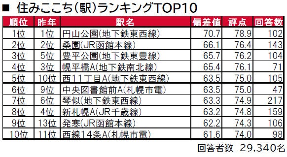 1位は、JR函館本線の「札幌」と地下鉄東豊線の「さっぽろ」の近隣駅を統合した札幌A(昨年表記は札幌G)が、4年連続で選ばれる結果となっています。なお、当駅は札幌都市圏在住のみを対象とした「住みたい街(駅)