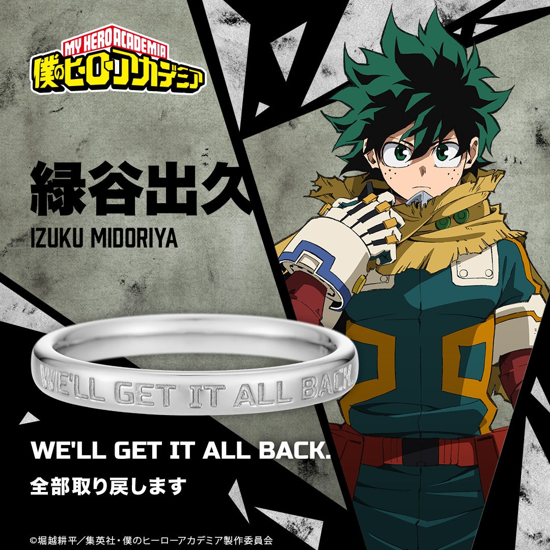 TVアニメ『僕のヒーローアカデミア』メッセージリング(指輪)第7弾(全5種類)緑谷出久の「全部取り戻します」など各キャラクターの印象的なセリフを英文で刻印しました。2024年7月5日(金)まで予約受付