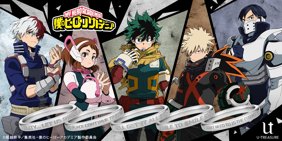 このたびの新作は、TVアニメ『僕のヒーローアカデミア』に登場する、緑谷出久、爆豪勝己、麗日お茶子、飯田天哉、轟焦凍、それぞれのセリフの英語版を抜粋し刻印したメッセージリングです。