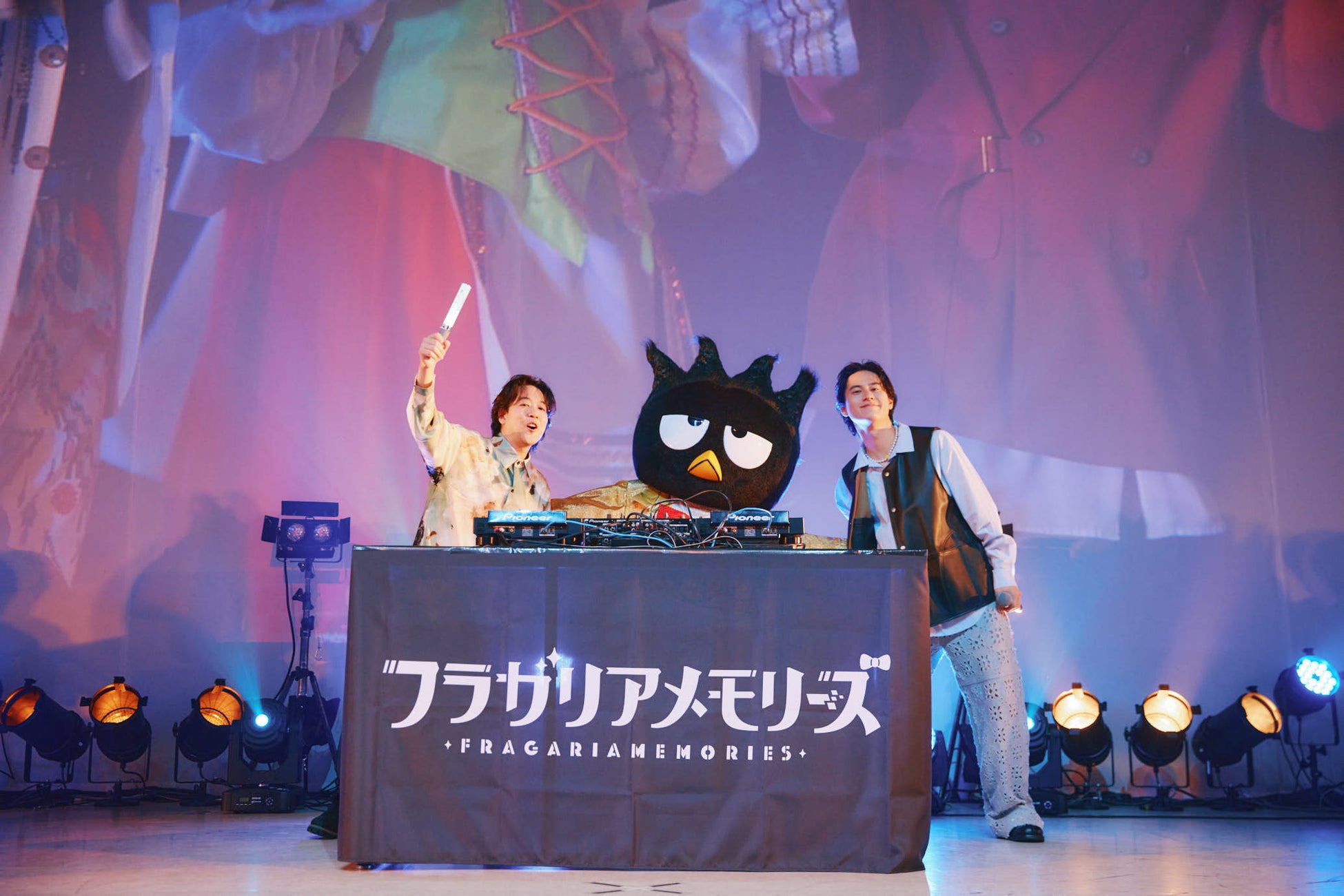 「推し活ピューロランドフェス」にちなみ音楽で会場を盛り上げるべく、クロミが登場しDJプレイを披露しました。ハローキティとあひるのペックルも登場し、「フラガリアメモリーズ」の展開の主軸であるオリジナル楽曲のうち、2023年にリリースされた『青空のメモリー』から2025年3月にリリースされた最新曲『言花サンセット』まで、全9曲をこの日限りのスペシャルメドレー形式でお届け。会場は大盛り上がりで、クロミに仕えるフラガリア「クロード」役の坂田将吾さん、あひるのペックルに仕えるフラガリア「アルペック」役の畠中祐さんは、それぞれが演じるフラガリアの主(ロード)と念願の初対面を果たし、「クロミ様に会えるのを楽しみにしていたので、ドキドキしています!」(坂田さん) 、「ようやく会えてうれしいです!かわいすぎる!」(畠中さん)と大興奮の様子でした。
