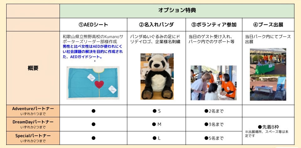 企業・団体様向けのご協賛プログラムです。ご協賛いただきました企業・団体様の名前を特設サイトへ掲載し、当日パーク内に設置する企業紹介ボードへ掲示いたします。また、イベント当日、協賛いただいた企業・団体様にご所属またはご勤務の方を対象とした視察・ボランティアの受け入れ、並びに18歳以下の障がいのあるお子さまを持つご家族を対象としたパークへのご招待枠をご用意いたします。