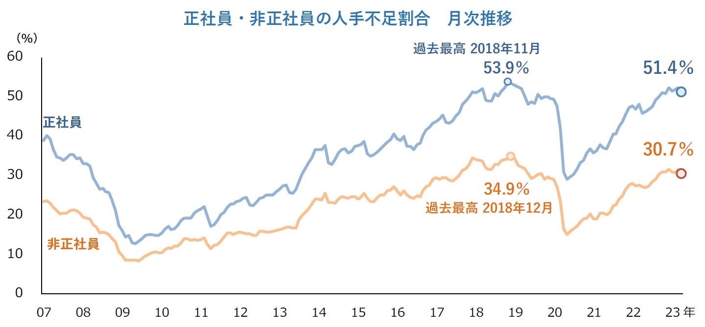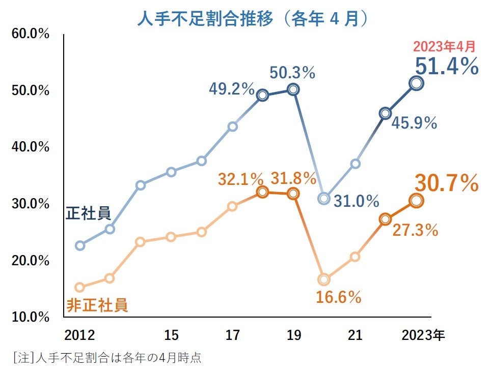 人手不足割合は正社員で51.4%、4月としては過去最高 非正社員でも4年ぶりに3割超