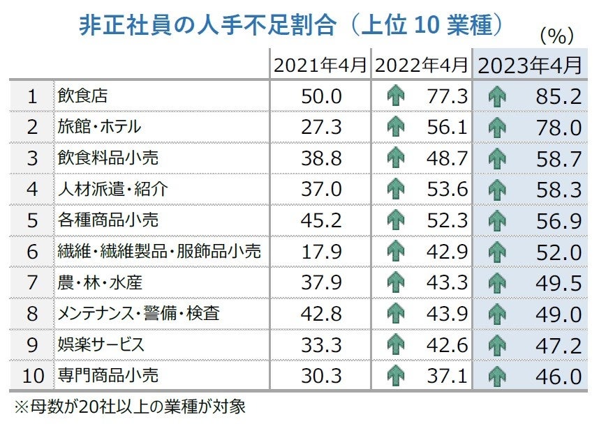 非正社員では30.7%が人手不足。業種別では「飲食店」が85.2%でトップとなり、「旅館・ホテル」(78.0%)が続く。小売業やサービス業など個人向け業種が上位に