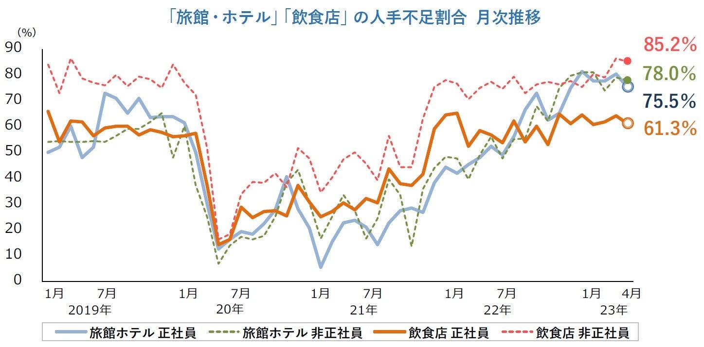 正社員の人手不足は51.4%、高止まり続く 「旅館・ホテル」は8割に迫る高水準 非正社員では「飲食店」が85.2%、コロナ前の水準に