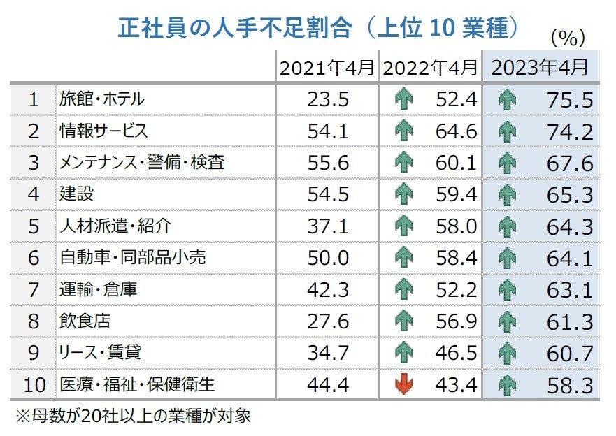 正社員の人手不足企業の割合は51.4%となった。業種別では「旅館・ホテル」が75.5%で最も高く、「情報サービス」(74.2%)、「メンテナンス・警備・検査」(67.6%)が続く