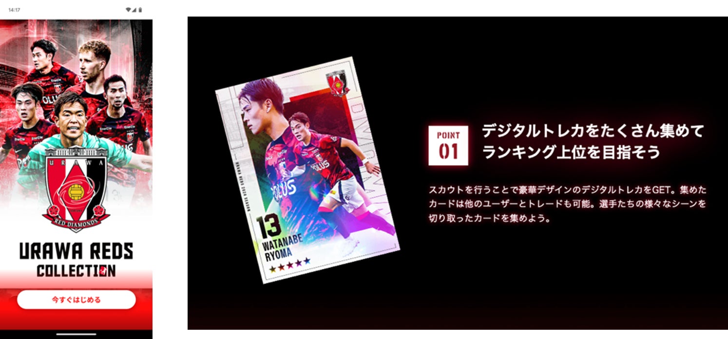 浦和レッズコレクションは、浦和レッズの選手たちの白熱したプレーシーンを豪華デザインのデジタルカードでお届けするデジタルコンテンツのコレクションサービスです。ユーザー同士のトレード機能や、ミッション機能を駆使してカードをたくさん集め、ユーザーの考えたドリームチームを作ることができます。集めたカードで、ユーザー同士で競い合うランキングで上位を目指す要素もあります。