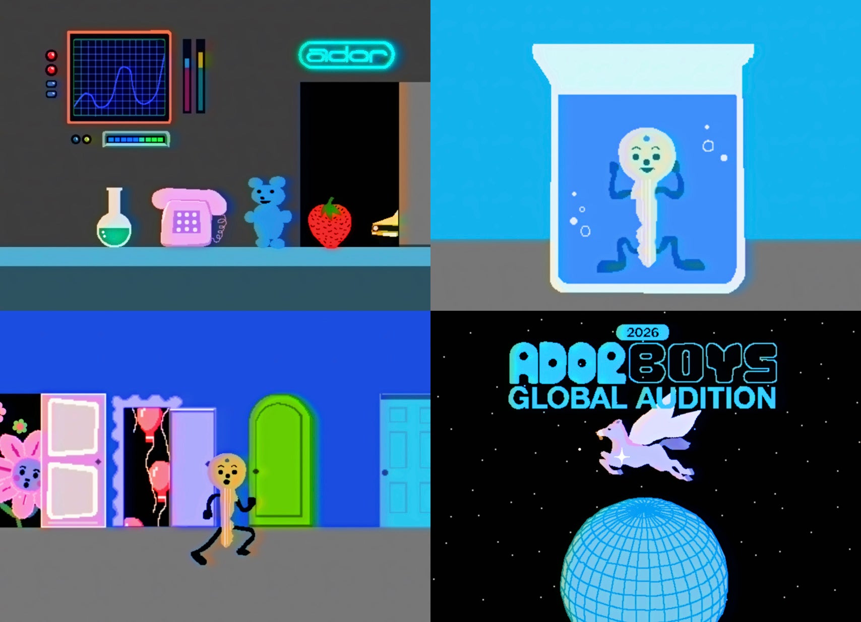 ADORは、オーディション開催の告知と共にショートフォームコンテンツも公開しました。ADORという実験室を経たアイデアが人の形に花開き、新しい世界の扉を通り抜ける過程を描いたアニメーションで、実験室(Lab)、ドア(Door)、鍵(Key)、人(Human)の4つの要素は、ADORの創作プロセスを象徴しています。