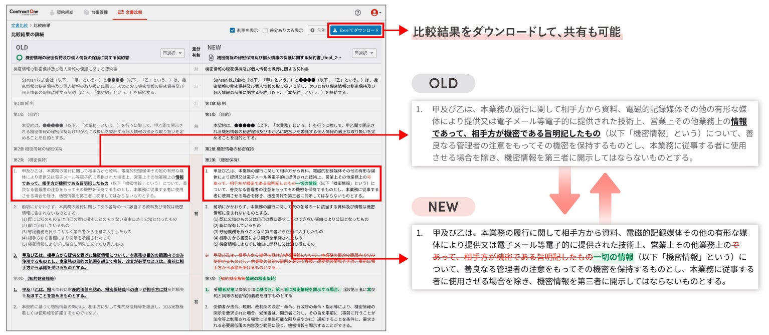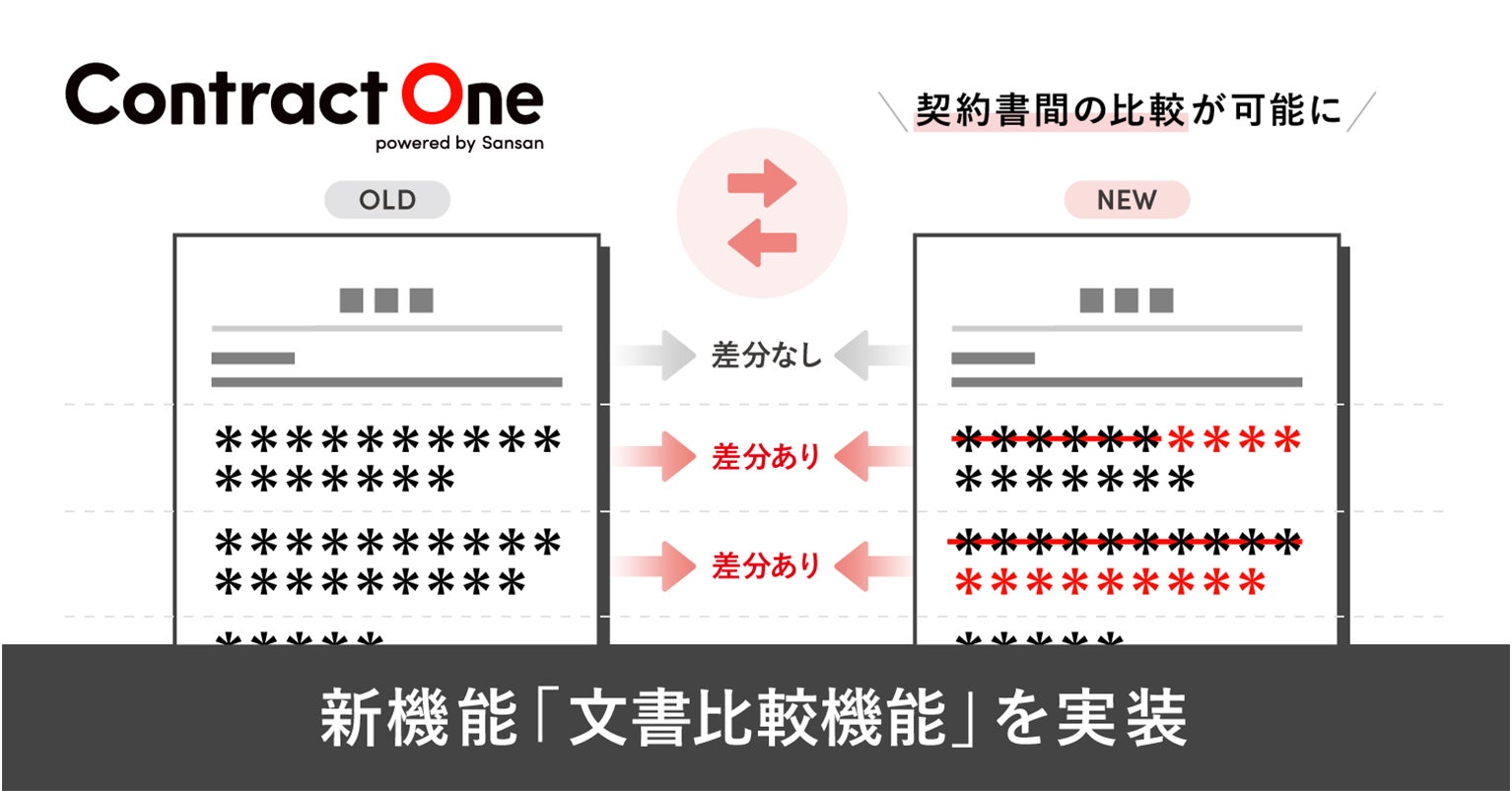 働き方を変えるDXサービスを提供するSansan株式会社は、契約データベース「Contract One(コントラクトワン)」において、契約更新などで新たな契約書を作成する際に、新旧の契約書間の差分を自動検出する「文書比較機能」の提供を開始しました。これにより、契約締結時の内容確認にかかる手間を大幅に削減します。
