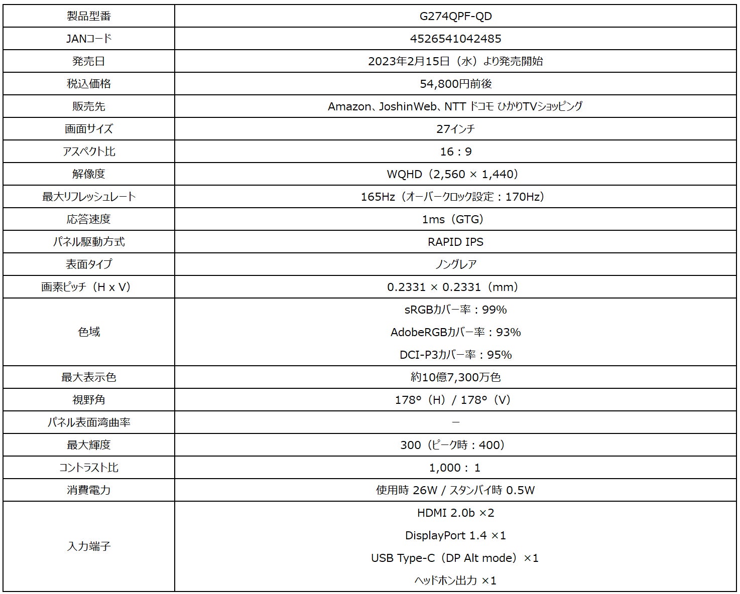 また、コストパフォーマンスに優れたゲーミングモニターブランド『G』シリーズより鮮やかな発色で綺麗な映像を楽しむ事ができる量子ドット技術を採用し、WQHD(2,560 × 1,440)解像度とRAPID IPSパネル搭載でリフレッシュレート170Hz(オーバークロック設定)と応答速度1ms(GTG)の高いスペックを誇るゲーミングモニター「G274QPF-QD」を同日発売致します。