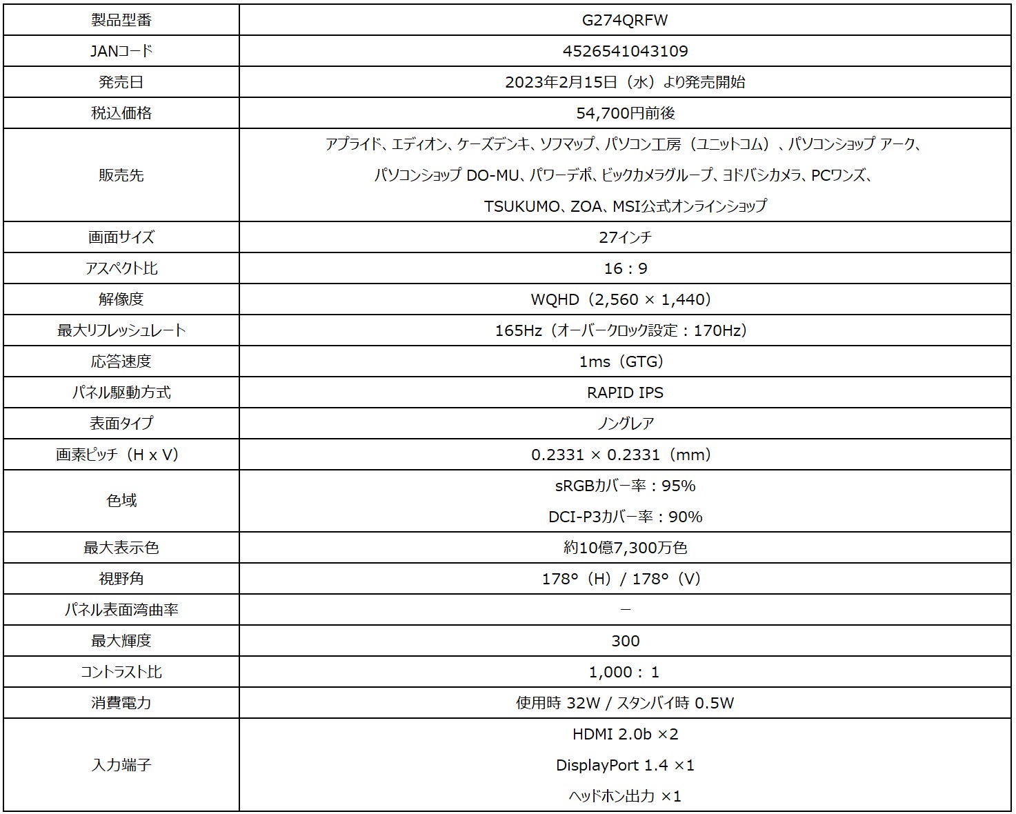 この度、エムエスアイコンピュータージャパン株式会社は2023年2月15日(水)よりゲーミングモニターの新モデルを発売いたします。コストパフォーマンスに優れたゲーミングモニターブランド『G』シリーズよりゲーミングモニターとしてはMSI初となる本体カラーに清潔感あふれるホワイトを採用し、WQHD(2,560 × 1,440)解像度とRAPID IPSパネル搭載でリフレッシュレート170Hz(オーバークロック設定)と応答速度1ms(GTG)の高いスペックを誇るゲーミングモニター「G274QRFW」が新たにラインナップに加わります。