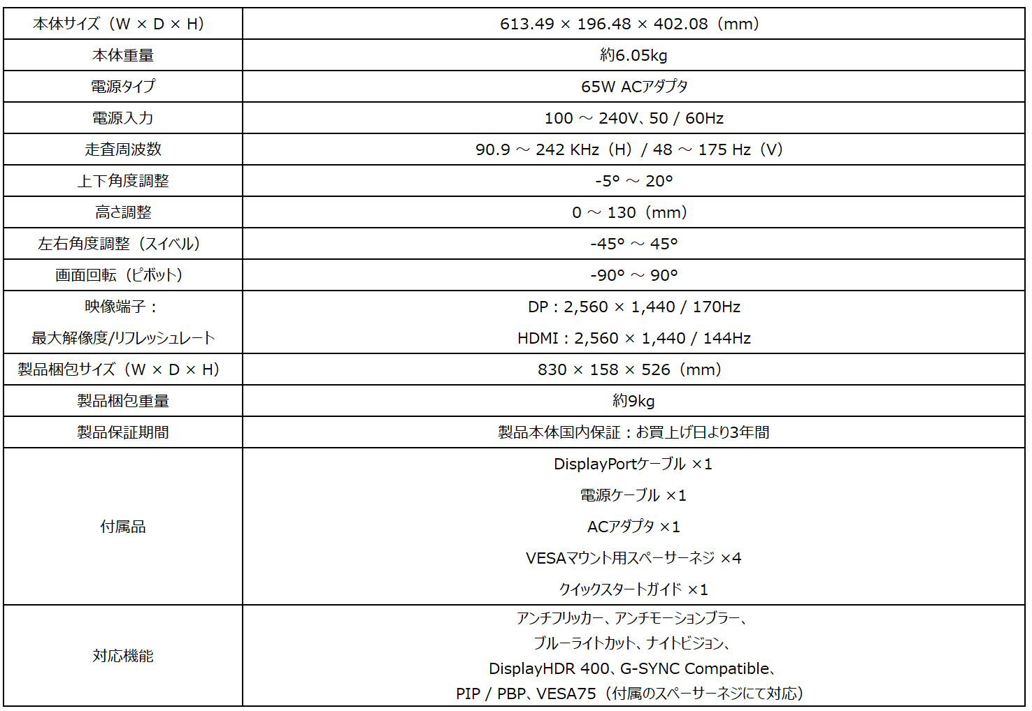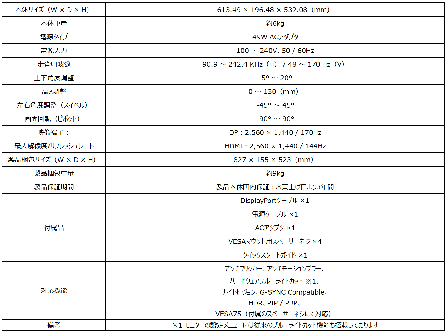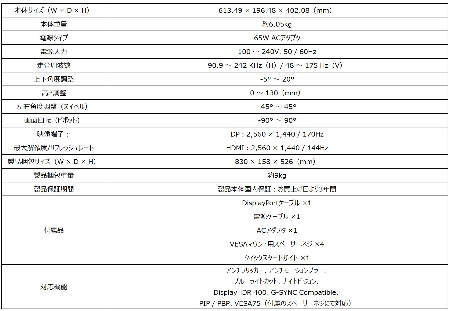 どちらのモデルも共通スペックとしてフルHDの約1.8倍の情報量で高精細な表示が可能なWQHD(2,560 × 1,440)解像度、高画質と高速応答を実現したRAPID IPSパネル、リフレッシュレート170Hz(オーバークロック設定)、応答速度1ms(GTG)の高いスペックを誇り、残像感の少ない映像で快適にゲームプレイを楽しむことが出来ます。さらに、同期機能としてG-SYNC Compatible、暗いシーンでも視認性を上げるナイトビジョンを搭載しており、よりゲームを楽しみたい方にお勧めなゲーミングモニターです。また、エルゴノミクスデザインを採用したスタンド機能で無理のないポジションで使用することができ、長時間の使用でも疲れを軽減します。入力端子はHDMI 2.0b ×2、DisplayPort 1.4 ×1に対応しており、PCとゲーム機など複数の機器を接続する事が可能で、背面のジョイスティックを操作することで簡単に入力切り替えやメニュー操作を行うことが出来ます。さらに、VESA規格にも対応しており付属のスペーサーネジを使用する事でモニターアームに取り付ける事が可能です。