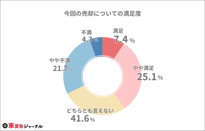 車を売却した231人全員に対し満足度を聞いたところ、「満足」と「やや満足」を合わせて75人(32.5%)が肯定的な評価をした一方で、「不満」と「やや不満」を合わせて60人(26.0%)が否定的な評価をしました。「どちらとも言えない」が96人(41.6%)と最も多く、明確に満足と評価した方は3割程度にとどまりました。