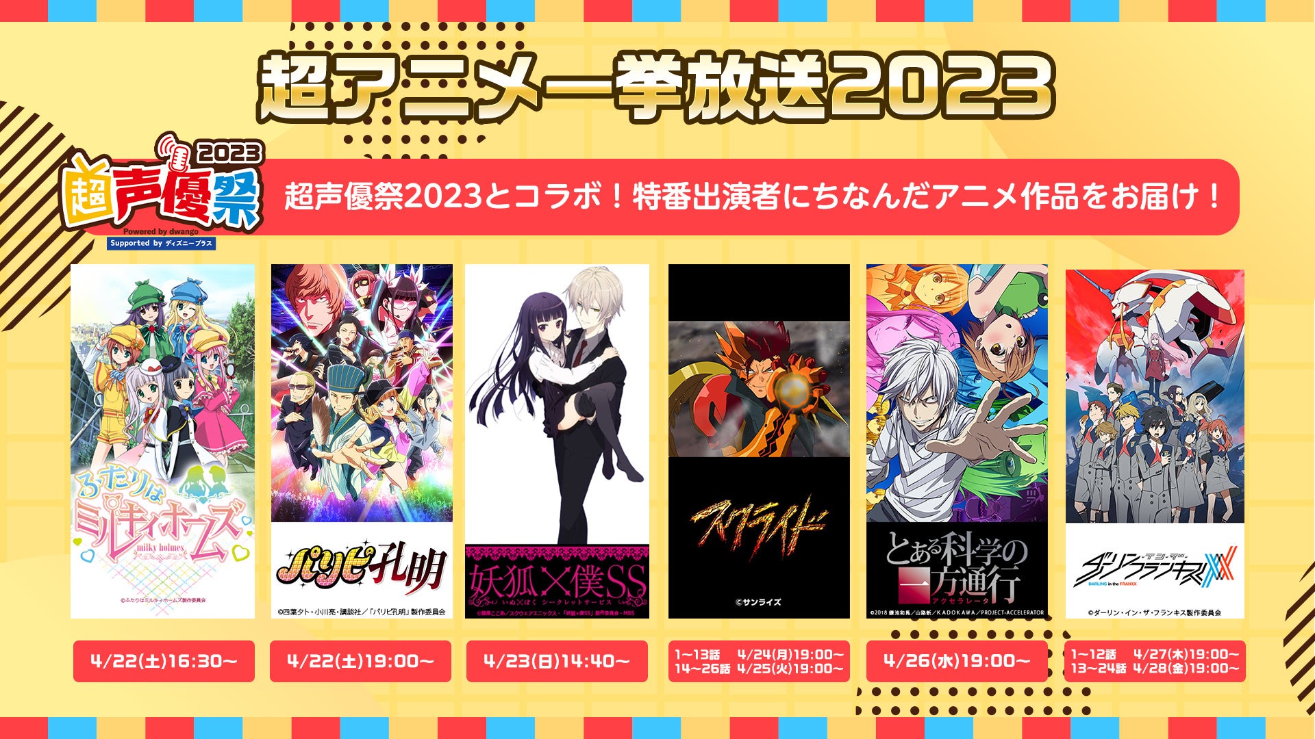 「ニコニコ超会議2023」と同時開催の「超声優祭2023」特番出演者にちなんだ作品として「ふたりはミルキィホームズ」「パリピ孔明」「妖狐×僕SS」「スクライド」「とある科学の一方通行」「ダーリン・イン・ザ・フランキス」を放送。